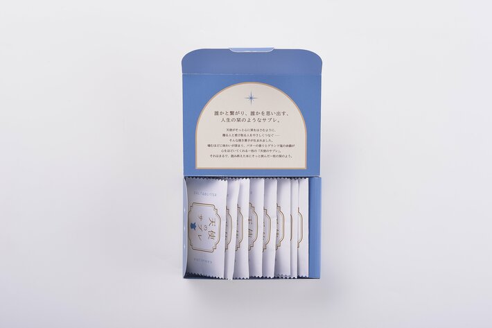 ニュージーランド産のバターとゲランド塩が引き出す、香りと食感と余韻をお楽しみいただければ幸いです。思い出すと、あたたかい気持ちになる--その一瞬の“記憶”に寄り添う、人と人をつなぐ「天使のサブレ」、あなたと誰かの「栞」になるような一枚をどうぞ。