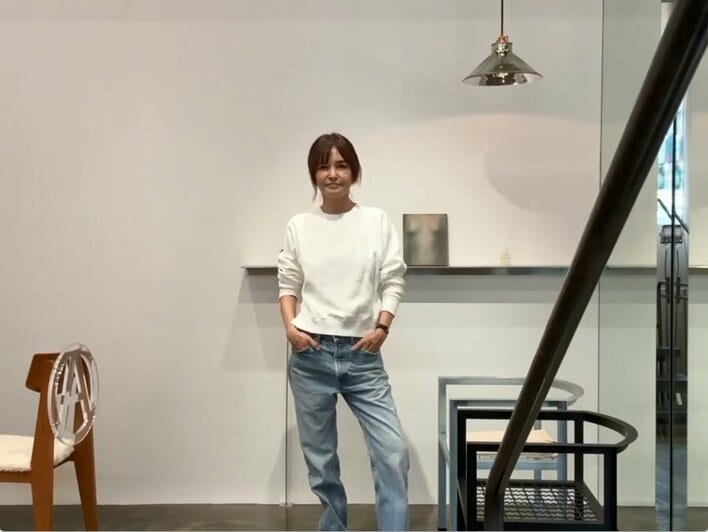 白いトレーナーにデニムを合わせたスタイルで、スマートな立ち姿を見せている梨花さん。