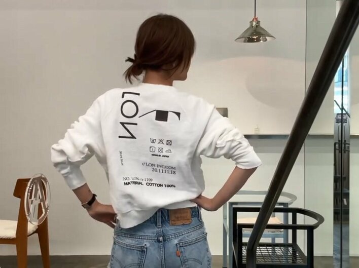 トレーナーの後ろにアイロンのかけ方などの洗濯表示がデザインされた、個性的な洋服に身を包んでいます。