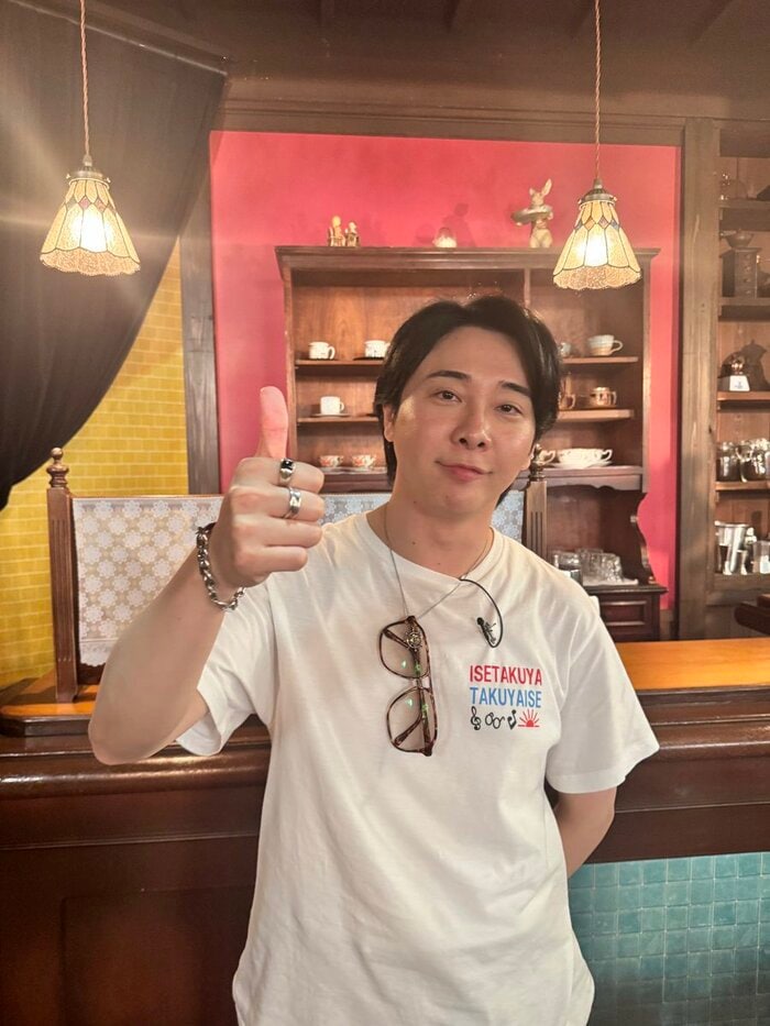 特別編のドラマ内で披露した、胸元に「ISETAKUYA TAKUYAISE」とデザインされた白Tシャツ姿で、グッドポーズをしています。