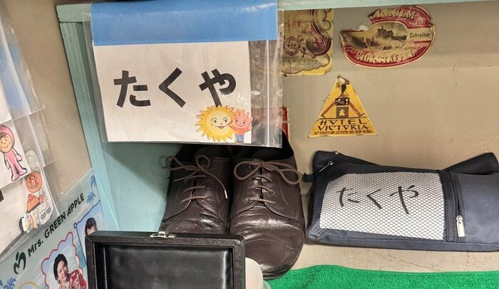 また、スタジオ内を移動する際に履いていたものでしょうか。黒のサンダル両方にシールが貼られていて、左から読むと「たくちゃん たくちゃーーーん」と書かれています。最後には太陽と手を挙げるイラストも。