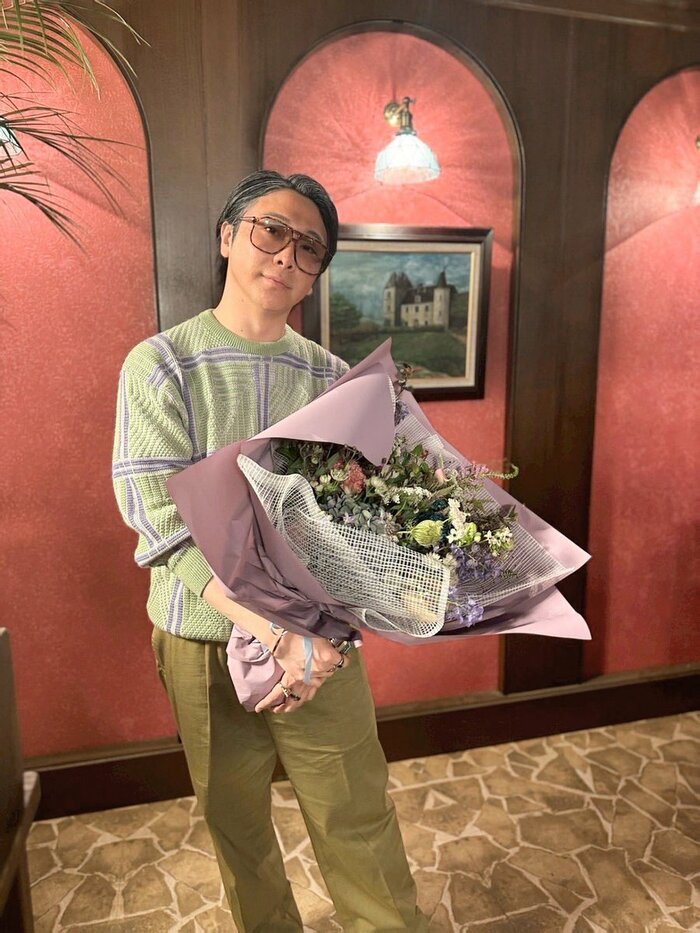 公開された写真には、白髪混じりの髪形、緑のニットにパンツを合わせたスタイルで、淡いカラーの花束を持つ大森さんの姿が。