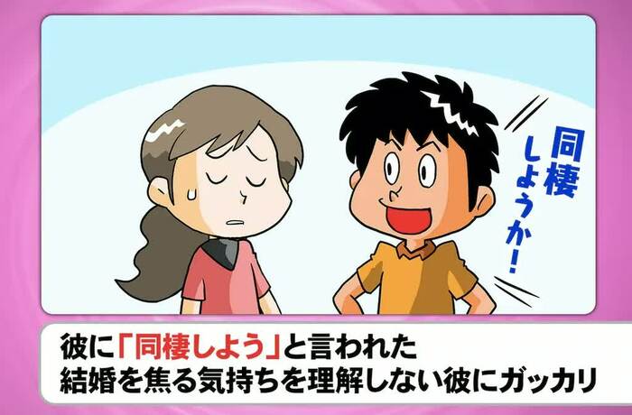 となり、スタジオでも「まずは男性の結婚に対する考え方を聞くべき」「そのまま同棲したらズルズル行ってしまう」というトークの流れに。
