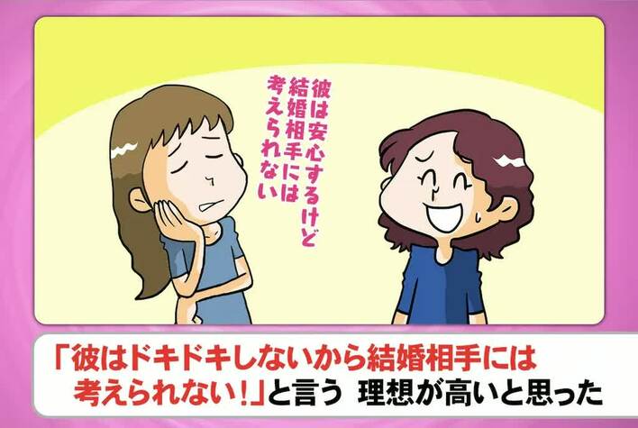 まず紹介されたのは、「結婚願望もあり、彼氏もいる友人が、彼にはドキドキしないから結婚を考えられないと言っている」という女性のエピソードです。
