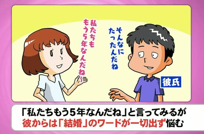 「5年付き合っている彼氏から、結婚のワードが出てこない。どうやって促したらいいか」というアラサー女子や、「1年前から付き合っている彼氏に、同棲しようと言われた。結婚を焦る気持ちを理解してくれず、ガッカリ」という36歳女性のお悩みも登場しました。