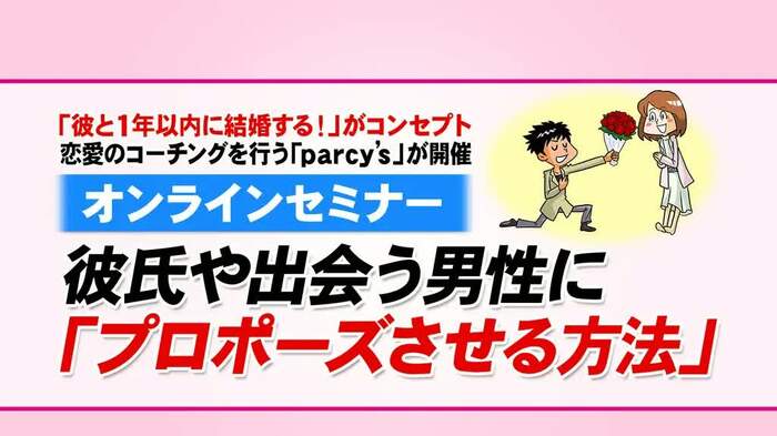 番組では、恋愛のコーチングを行う会社「parcy’s」が主催した、「彼氏や男性にプロポーズさせる方法」というオンラインセミナーの様子も取材。