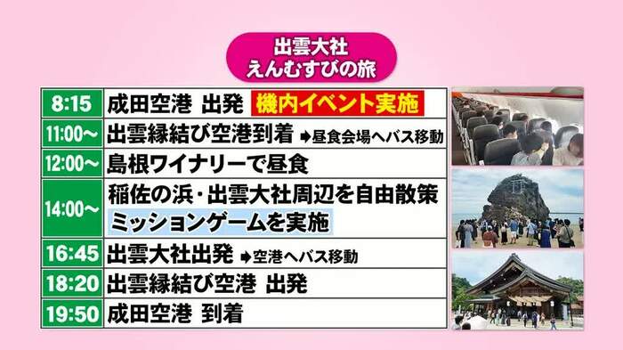 出会いのきっかけ作りの一例として、貸しきりの飛行機で出雲大社を往復し、その時間で婚活をする「出雲大社えんむすびの旅」という企画も紹介されました。