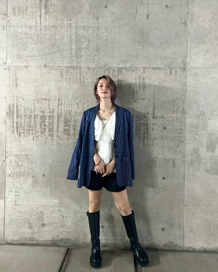 公開された写真には、ストライプ柄のジャケットに、黒のショートパンツ、黒のロングブーツ姿の剛力さんが。