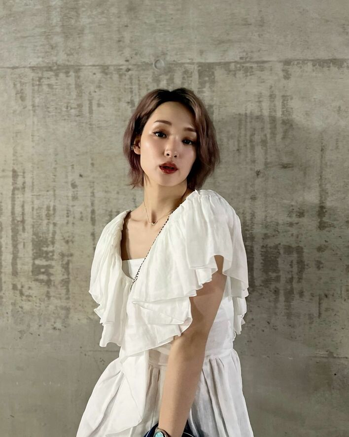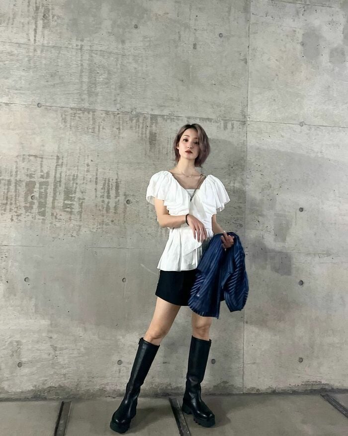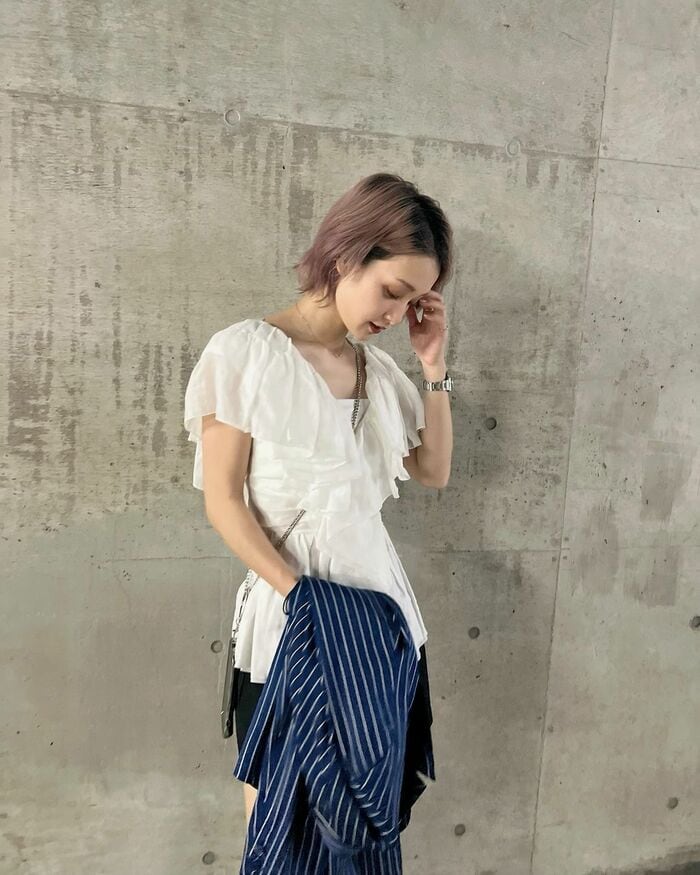 他にも、ジャケットを手に持ち、鎖骨が見える白のフリルが付いたトップスが目を引くショットも公開されています。