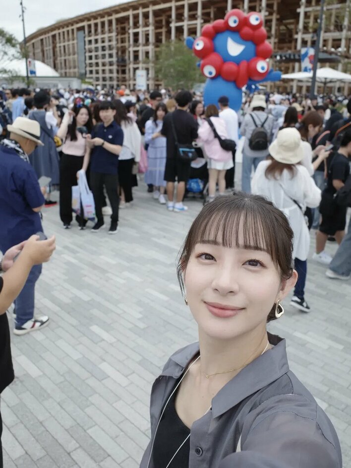 足立梨花 大屋根リング&ミャクミャクを背に自撮りショット