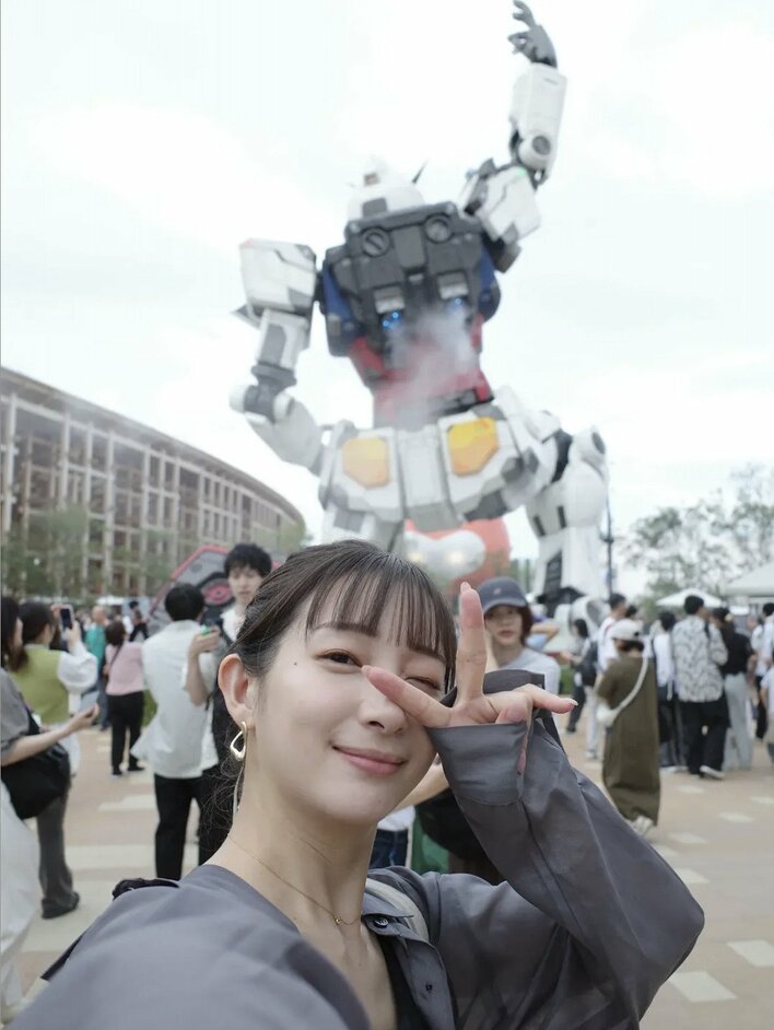 足立さんはさらに、「未来のもしもの世界が楽しくて宇宙でモビルスーツたちが働いていると思うとふと空を見上げる頻度が高くなりそうでした」と、ガンダムの世界に浸ると、実物大ガンダム像の背後でも自撮りする足立さん。目元でピースをしてウインクショットを披露しています。