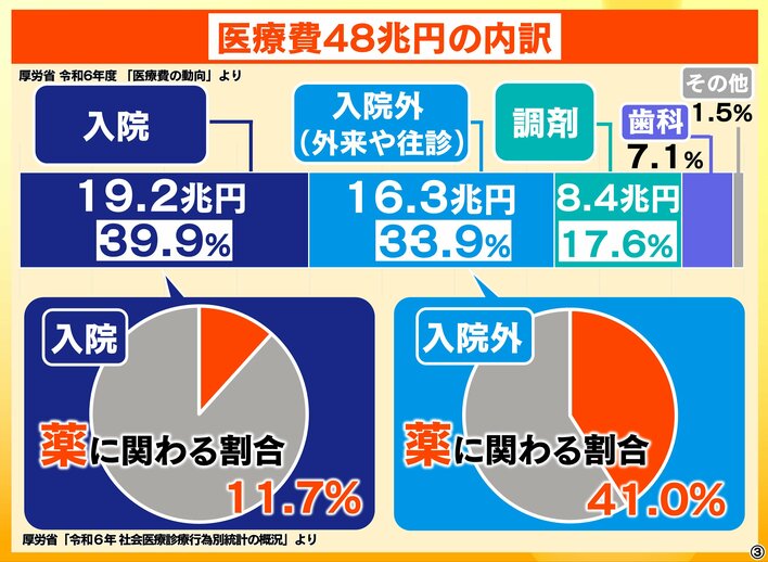 2024年度の医療費48兆円のうち、入院が19.2兆円(39.9%)、入院外が16.3兆円(33.9%)となっており、そのうち、入院で薬に関わる割合は11.7%、入院外は41.0%を占めています。