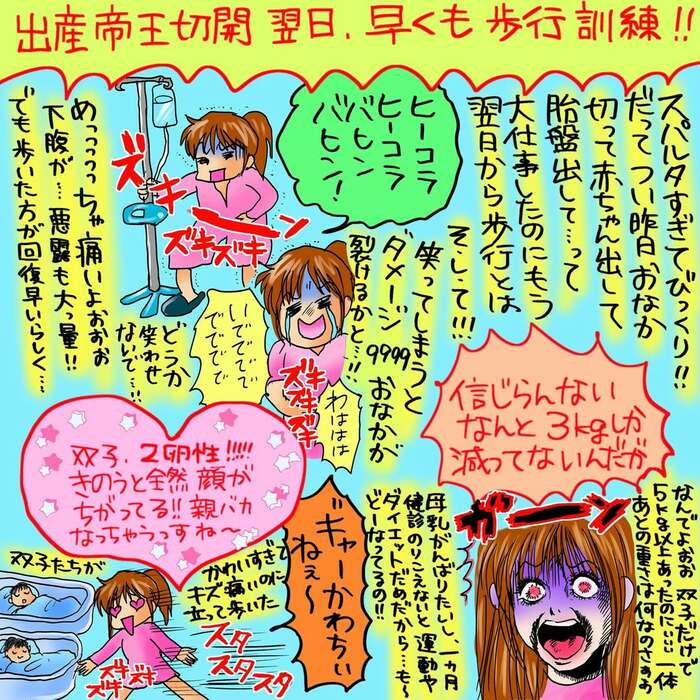 「出産帝王切開 翌日、早くも歩行訓練!!」と大きな文字で記された真下には、点滴スタンドを杖のようにし、歩行の練習をする中川さんの姿が。下腹部には激痛がはしっているようで、青ざめながらも、おなかに手を添えて歩みを進める姿が描かれています。「めっっっっっちゃ痛いよぉぉぉ」とその文面から痛みが伝わってきますね。