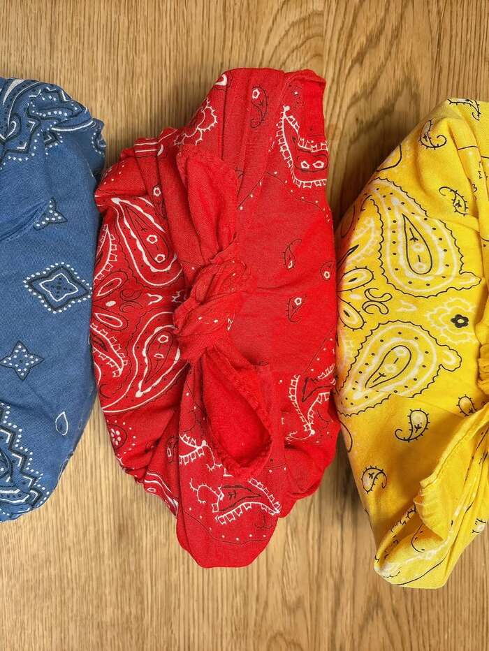 「包んだら、信号の色だった」というコメントとともに公開された写真には、青色と赤色と黄色でそれぞれ包まれているお弁当箱が収められています。