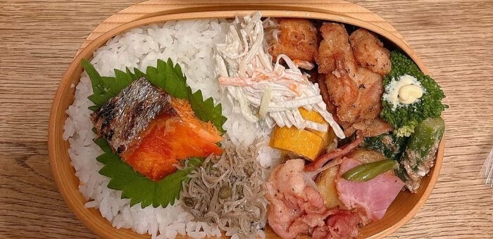 おかずエリアには、良い香りが漂ってきそうな唐揚げや卵焼き、焼き色がついたベーコンが入れられています。また、ゴボウサラダやブロッコリーも添えられ、栄養バランスもバッチリです。