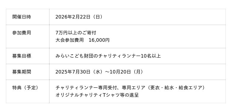 全国の児童養護施設の子どもを支援する一般財団法人みらいこども財団(本部:大阪市中央区、代表理事:谷山昌栄)は、大阪マラソン2026のチャリティ寄附先団体に決定し、チャリティランナーを募集中です。「走ること」で子どもたちを応援しませんか?初心者も大歓迎、また寄附のみでも応援できます!