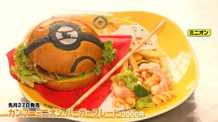 そんなカンフーダンスにかやちゃんも全力で挑戦!「こんなに動けて元気になれるイベントがあると知らなかったのでアチョ~元気になれました!」と、大興奮!さらに体を動かした後は、かわいすぎるミニオン・フードでおなかを満たします。こちらは、先月27日に発売された「カンフーミニオン・バーガープレート」。バンスのミニオンはカンフーをイメージしてキリッとした表情に。
