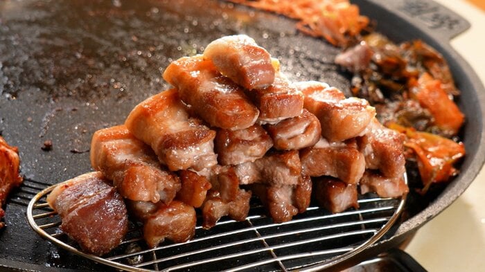 目を見開き「うんまっ、うんまっ」(やす子)、「あぁうまっ」(河野)、「うんま」(山里)と、ただただ感嘆の声を漏らし、あまりの感動に店員と握手。韓国通の河野さんでさえ「今まで、たくさん韓国でサムギョプサルを食べてきたんですけど、初めての驚きがありました」と語るほど、特別な食体験に。