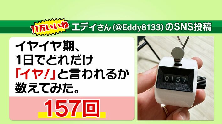 まず紹介されたのは、「イヤイヤ期の子どもが1日で何回『イヤ』というかカウントしたら、157回になった」という2歳半の子どもを持つエディさんのSNSへの投稿です。