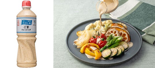 (左)たのしお ごまドレッシング(右)メニュー:焼き野菜のサラダ たのしお ごまドレッシング