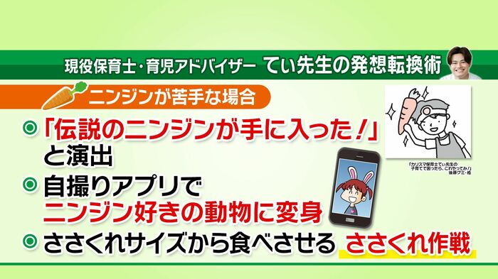 例えば「伝説のニンジンが手に入ったよ」と声をかけ、自撮りアプリでニンジンが好きな馬やウサギに変身させて“ごっこ遊び”をしながら食べてみたり、食材を小さな“ささくれサイズ”に切ってお皿に乗せ、食べられたら褒めるを繰り返したりすると、好き嫌いは克服しやすいのだか。