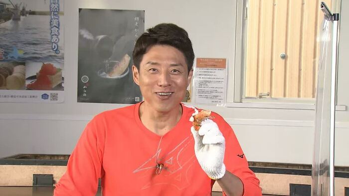 価格はタラバガニよりも安価ですが、抜群においしいというイバラガニ。松岡さんは焼きあがったイバラガニを軍手で掴み、アツアツを口に運ぶと目を輝かせてキョロキョロし、「これはゴールデン!おいしいですね!」と大喜び。