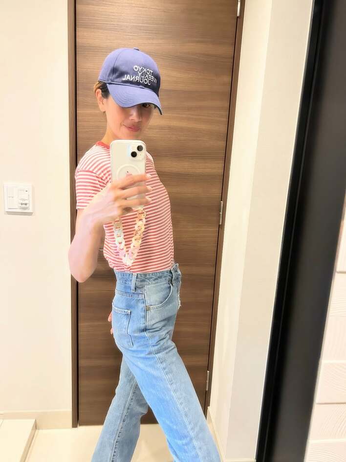 鏡越しの自撮りショットには、赤と白のボーダーTシャツにデニム、ネイビーのキャップを身に付け ほほ笑む長谷川さんの姿が。息子のTシャツを見事に着こなし、日々のトレーニングの成果がうかがえるスリムなボディラインが際立っています。