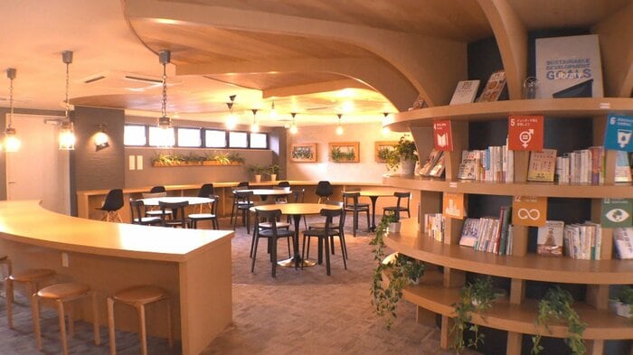 ロビーを通り、中に入ると1階のラウンジスペースには座敷や図書スペースもあり、外には、中庭も整備されています。
