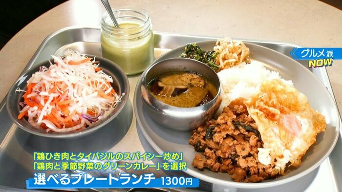 長尾さんは「選べるプレートランチ(1300円)」で、「鶏ひき肉とタイバジルのスパイシー炒め」と「鶏肉と季節野菜のグリーンカレー」をチョイスです。