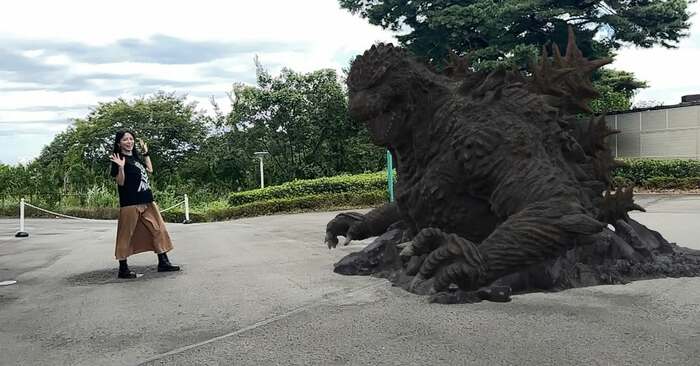 さらに、「機龍のTシャツ着て参戦」というハッシュタグと共に、ゴジラのモニュメントとのツーショットを披露。