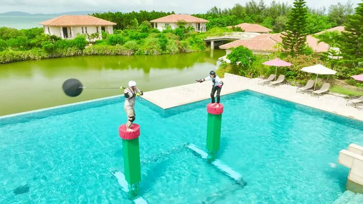 プールの水面から高さ2メートルの台の上で落とし合う、「水上バトルロワイヤル」や、海上に作られた特設アスレチックコースを駆け抜け、40メートル先の浜辺に差し並べられているフラッグの中からたったひとつだけの“当たり”を見つける「水上アスレチックフラッグ」など、身体能力だけでなく、運も試される迫力満点のゲームで対決します。
