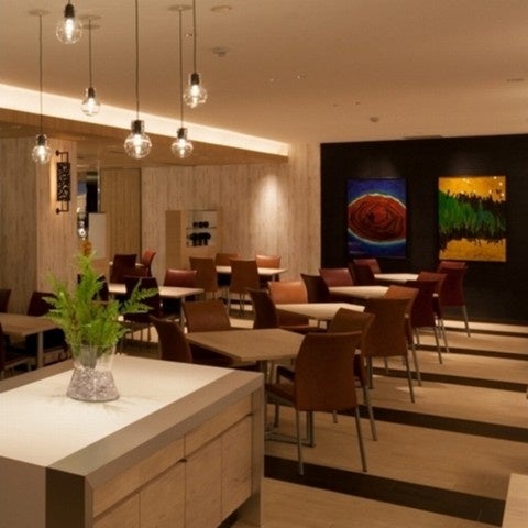 レストラン写真:木の温もりとアートが彩る、越後の味覚を楽しむダイニング空間