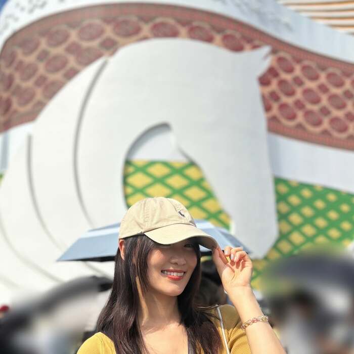 「夜ご飯はトルクメニスタン館のカフェでいただきました 美味しかったーー」と、夜はトルクメニスタン館で堪能した菅井さんは、自身も馬術競技の経験者だったりと、馬が大好きということもあり、「黄金の馬」で知られるトルクメニスタン原産の“アハルテケ”がかたどられたトルクメニスタン館の外観をバックに記念撮影。