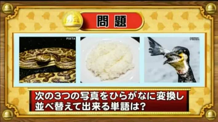 最初は「脳ミングアップクイズ」から、シャッフル写真の問題。次の3つの写真をひらがなに変換し、並べ替えて出来る単語は何でしょうか?
