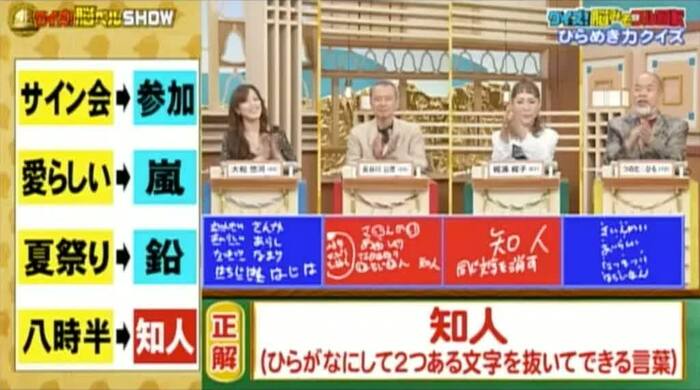 正解は「知人(ひらがなにして2つある文字を抜いてできる言葉)」。長谷川さんと梶浦さんの2人が正解!