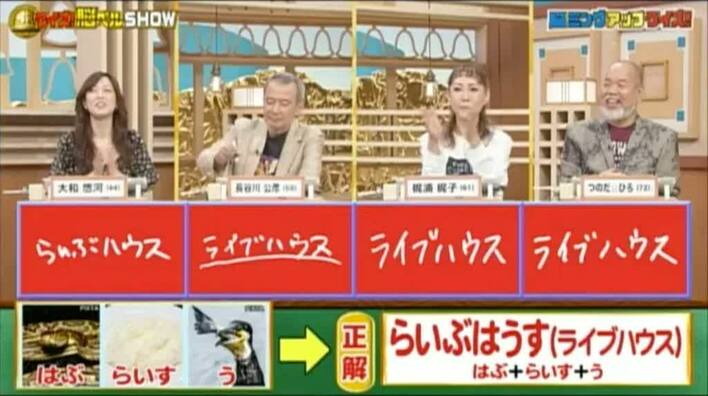 正解は「らいぶはうす(はぶ+らいす+う)」。見事全員正解。