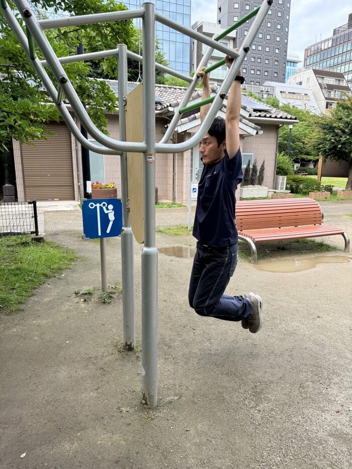 「公園の遊具でストレッチ中…?」という文章とともに投稿されたこの写真。