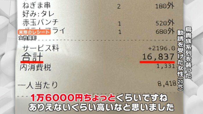 案内された“系列店”とされる店で、ドリンク4杯と焼き鳥などを頼み、5000円ほどの伝票を渡されたといいますが...。