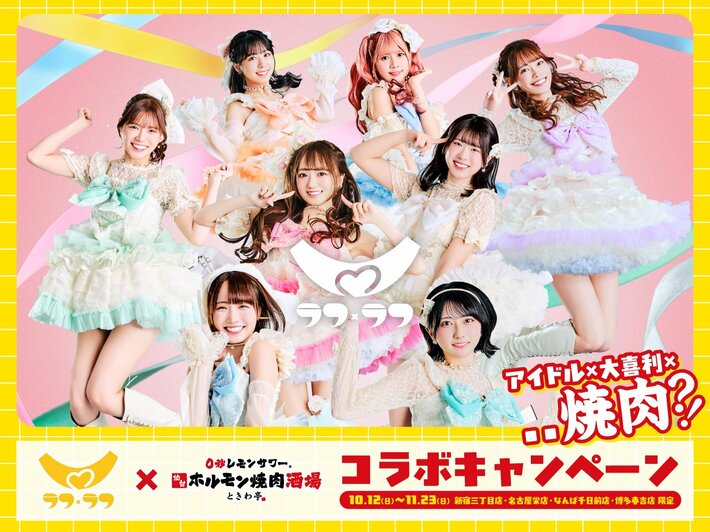 ときわ亭では、大喜利もできるバラエティーアイドルとして人気上昇中の8人組アイドルグループ「ラフ×ラフ」の初のライブハウスツアーに合わせ、4つの開催都市の4店舗でコラボキャンペーンを開催します。