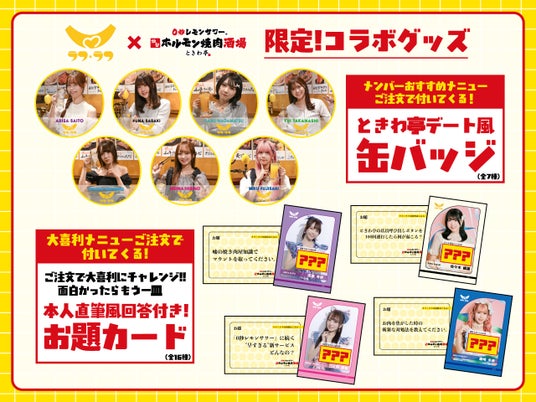 期間中、対象店舗で「大喜利牛タン」または「大喜利ハラミ」を注文し、お題に答えるかたちで大喜利にチャレンジ。スタッフの正誤判定で◯が出たらもう一皿プレゼントします。また、「ラフ×ラフ」メンバーおすすめのメニューを注文すると、「ときわ亭デート風缶バッジ」をプレゼントします。