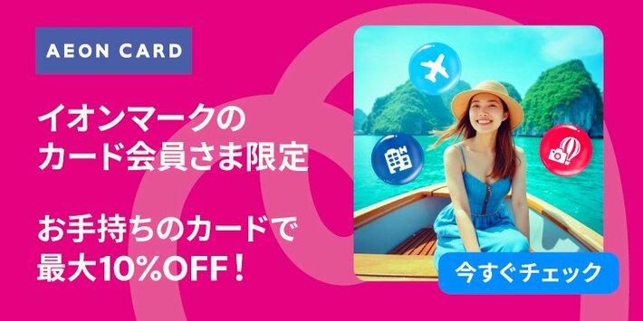 日本で発行されたイオンマークのクレジットカードまたはデビットカードでお支払いいただくと、最大 10%相当の割引クーポンをご利用いただけます。