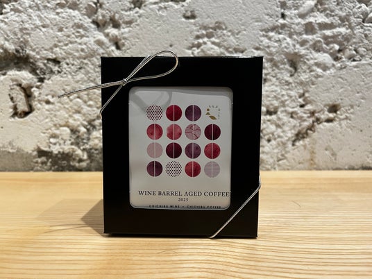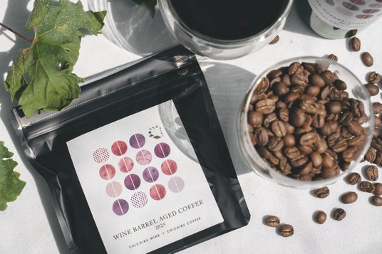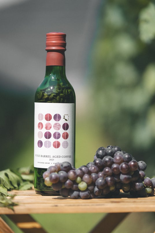 本商品には、過去に数度の受賞歴もある、秩父ワイン自社畑「唐沢(KARASAWA)」で収穫された「メルロ」の熟成に使用された樽を使用。コーヒー豆の選定にあたっては、世界各国7種類のコーヒーをテストした後、焙煎度合いも浅煎りから深煎りまで段階的に微調整を行い、ちちぶコーヒープロデューサーの国際コーヒー鑑定士・福田歩惟(あい)がカッピングして厳正に選定した結果、良質でマイルドな酸味を持ち、ワインの香りが移った際に、コーヒー、ワインどちらの個性も際立つエルサルバドル産のコーヒーを選定しました。適切に温度・湿度管理されたちちぶコーヒーのラボ内に設置したワイン樽に、コーヒー生豆を移し、1日に1回撹拌しながら約1ヶ月熟成させ、ワイン由来の芳醇な香りを豆に丁寧に移しました。中煎りで焙煎されたコーヒーは、凝縮された赤ぶどう(グレープ)の果実味と、ワイン樽由来の余韻を楽しめる特別な味わいに仕上がっています。ホットはもちろん、アイスやカフェオレにしても相性がよく、さまざまなシーンで新しいコーヒー体験をお楽しみいただけます。