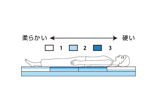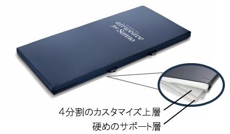 中材のエアファイバー(R)は2層構造。下層が全身をしっかり支え、上層は硬さの異なる4つのブロックを組み合わせカスタマイズが可能。4分割構造により、出産前後の体形変化に合わせて硬さを自由に調整することができます。