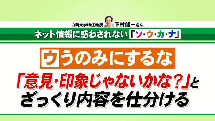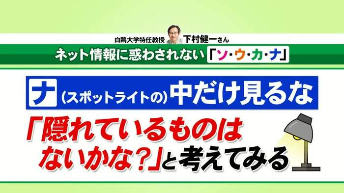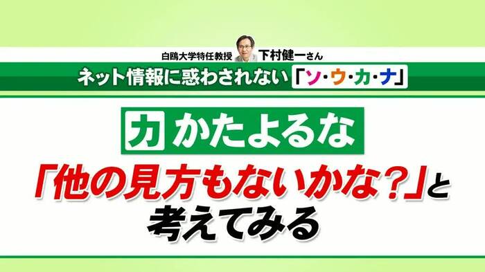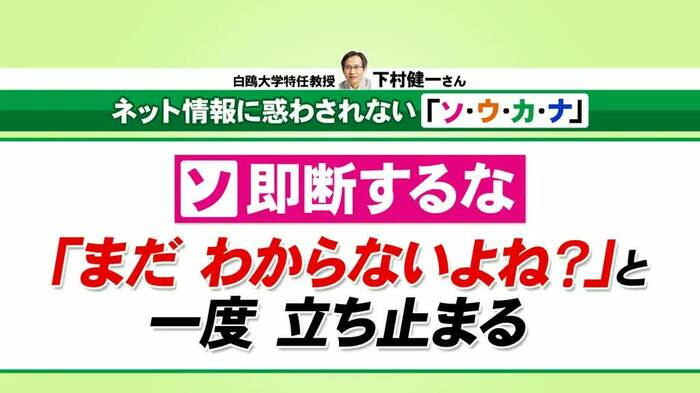 下村さんによると、デマを拡散しないために覚えておきたいのは「ソ・ウ・カ・ナ」の「ソ」=ネットの情報を「即断しない」ことだといいます。