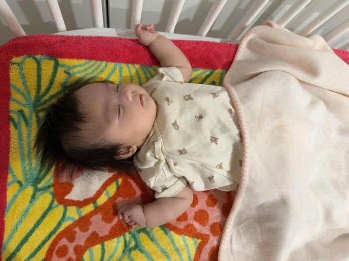 長女が使っていた「エルメス」のタオルの上でスヤスヤと眠る生後3ヵ月の次女の様子を公開しました。