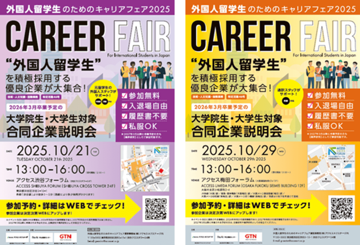 株式会社アクセスグループ・ホールディングス(東証スタンダード/福証本則・7042)の事業子会社で、人財ソリューション事業、教育機関支援事業を展開する株式会社アクセスネクステージ(本社:東京都渋谷区、代表取締役社長 増田智夫、以下「当社」)、株式会社学生情報センター(本社:京都府京都市、代表取締役社長 吉野一樹、以下、「ナジック」)、株式会社グローバルトラストネットワークス(東京都豊島区、代表取締役社長 後藤裕幸)の3社は、2025年10月21日(火)東京会場、10月29日(水)大阪会場にて、日本での就職を希望する外国人留学生を対象とした合同企業説明会「外国人留学生のためのキャリアフェア2025(以下、「本フェア」)」を共催いたします。