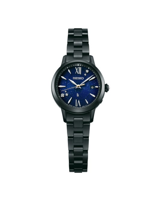 SSVW241は、オールブラックのケースとブレスレットに、繊細なラメを散りばめたダイヤルを組み合わせ、満天の星を表現しました。インデックスは、星のまたたきをイメージしてアシンメトリーに配し、1時・8時位置には、ひときわ輝く星を象徴した3石のラボグロウン・ダイヤモンドが美しく輝きます。
