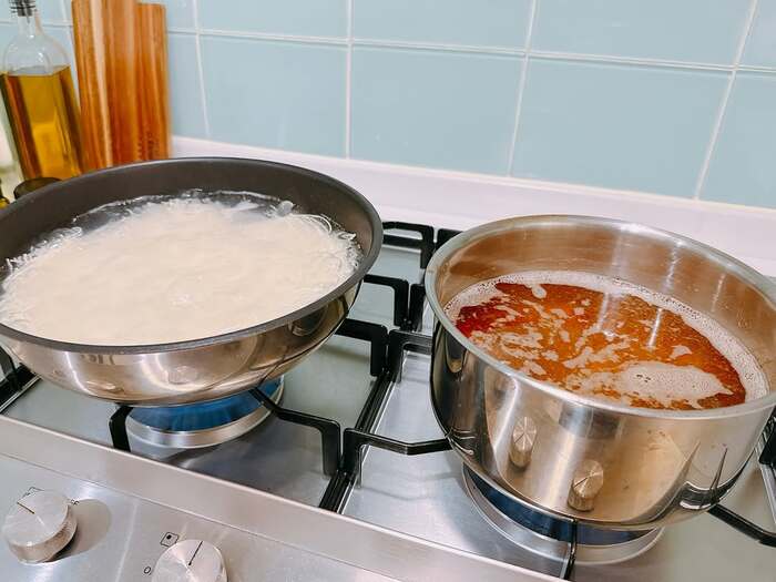 そうめんの横のコンロには、つゆを作る様子に・・・。