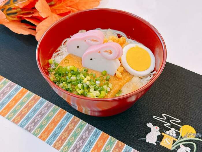 赤いお椀には、そうめんの上に油揚げとネギ、さらに“中秋の名月”ということで、まんまるな月をイメージしたゆで卵。そして、2匹のうさぎがちょこんと乗ったかまぼこ。