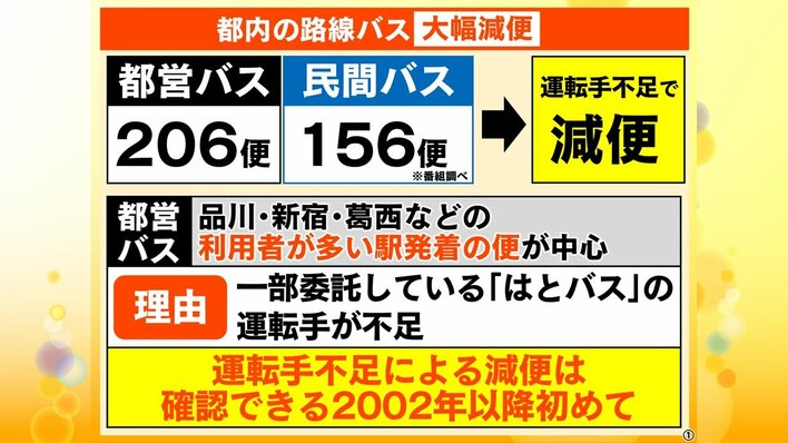 さらに、民間のバス会社3社でも、運転手不足などの理由で、路線バス150便以上が減便に。運転手不足による減便は、確認できる2002年以降初となります。